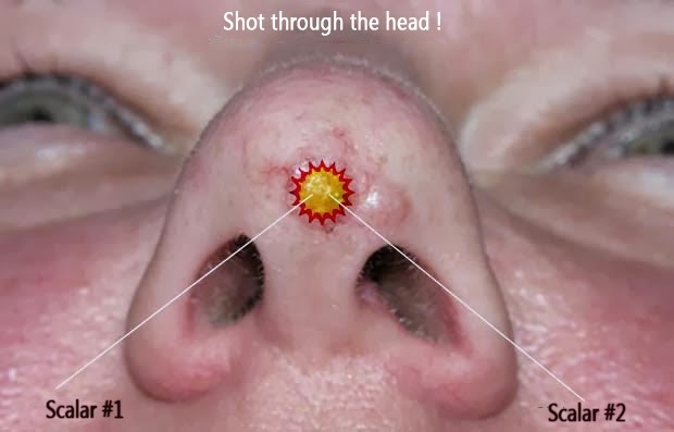 C. To shoot into the nose of a person, the energy zone doesn´t have to be necessarily in front of the victim. The two beams of scalar waves can also shoot through your head and unite after that on your nose, where they form a tiny energy zone directly on your skin, which will hurt.